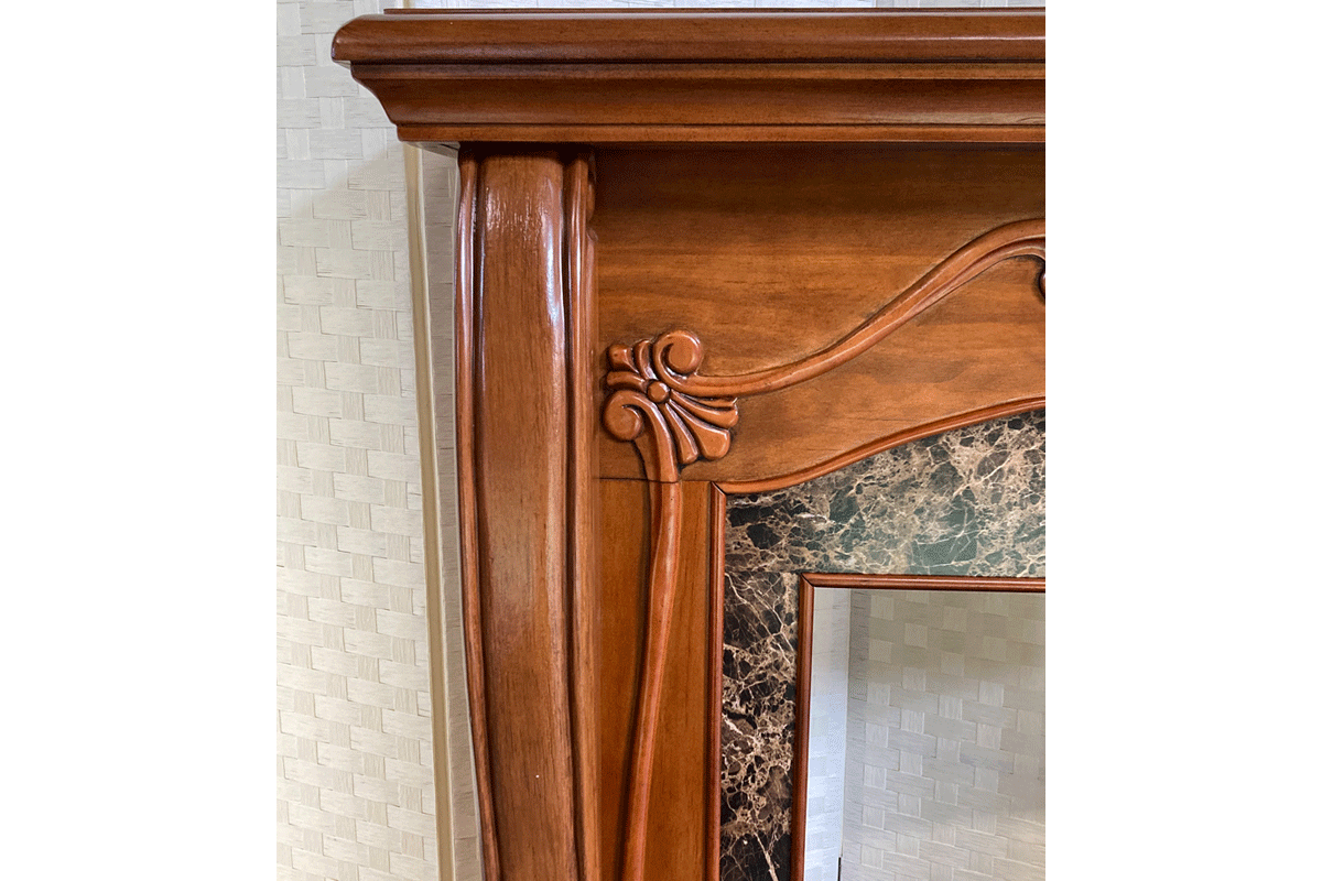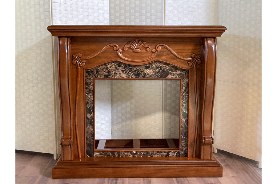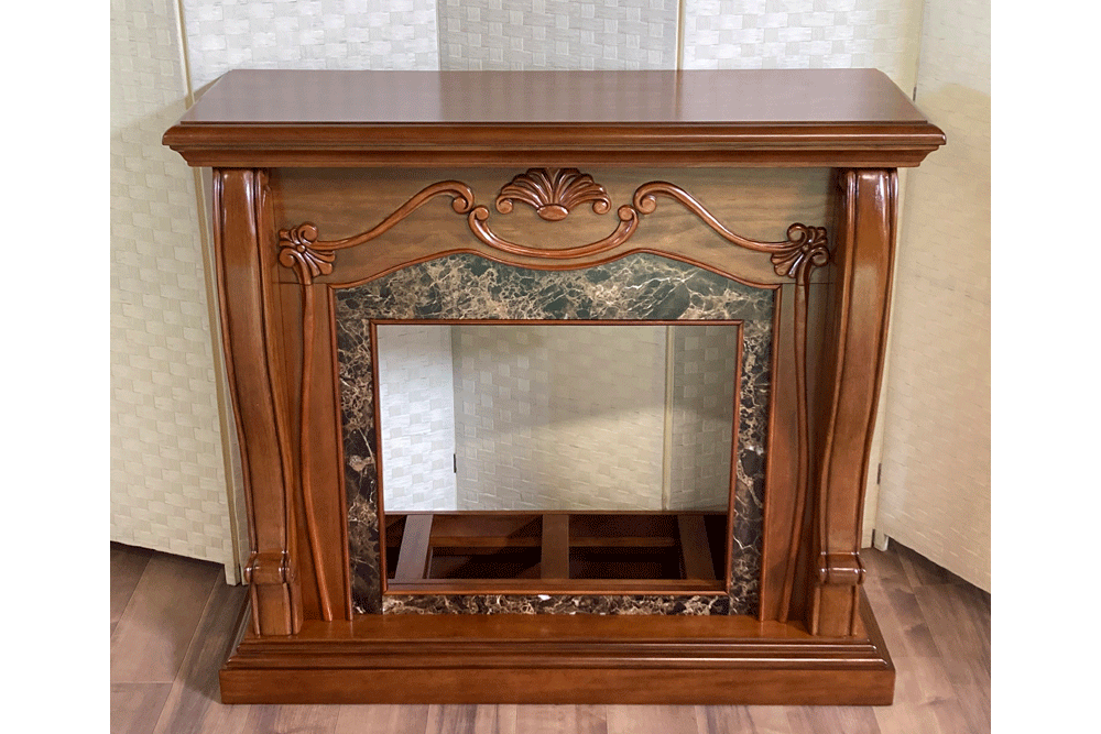 優雅なビクトリア調のデザインのウォールナット仕上げとブラウンマーブルの組合せが豪奢な電気暖炉です。