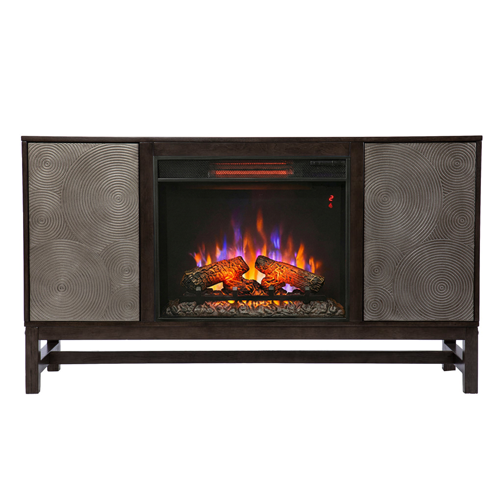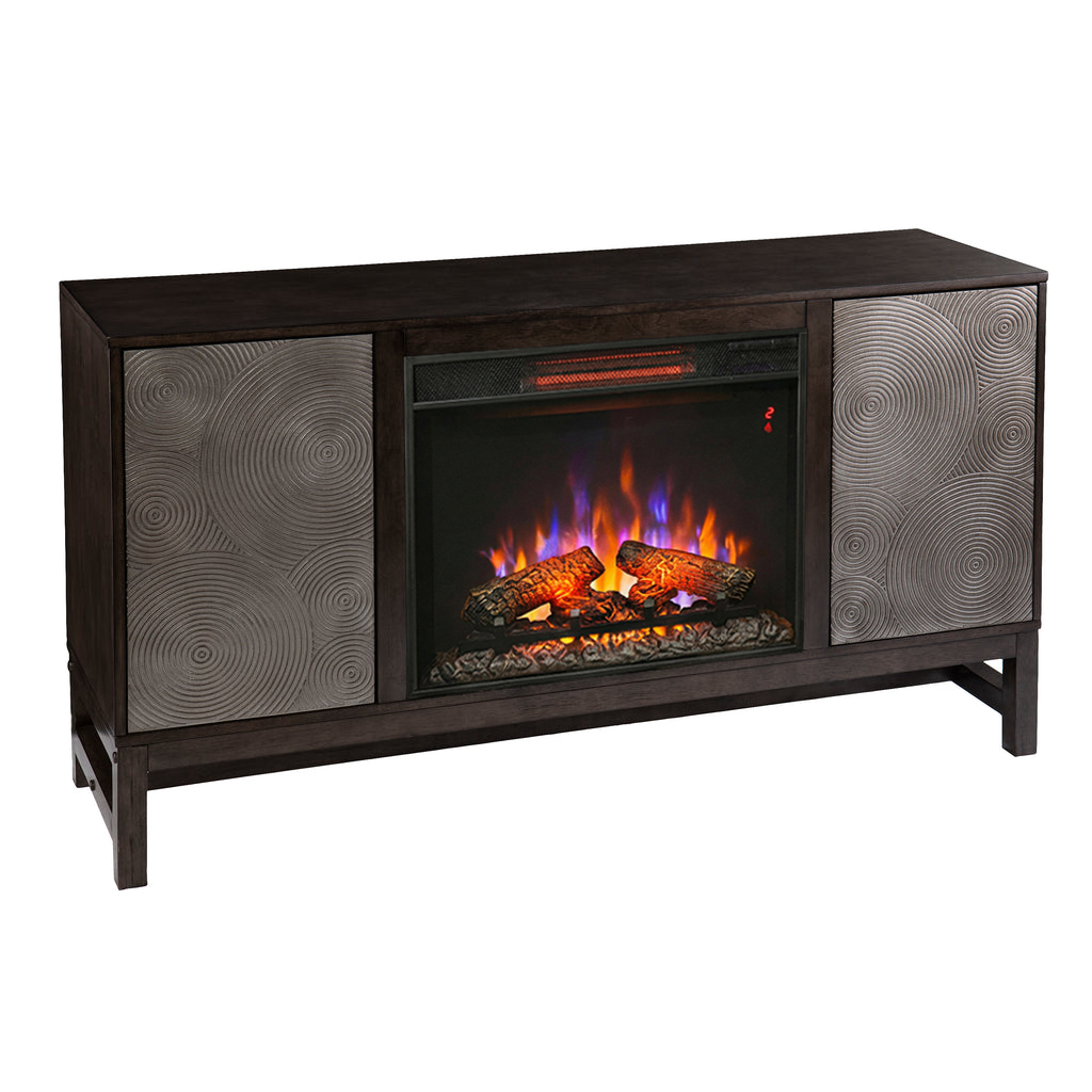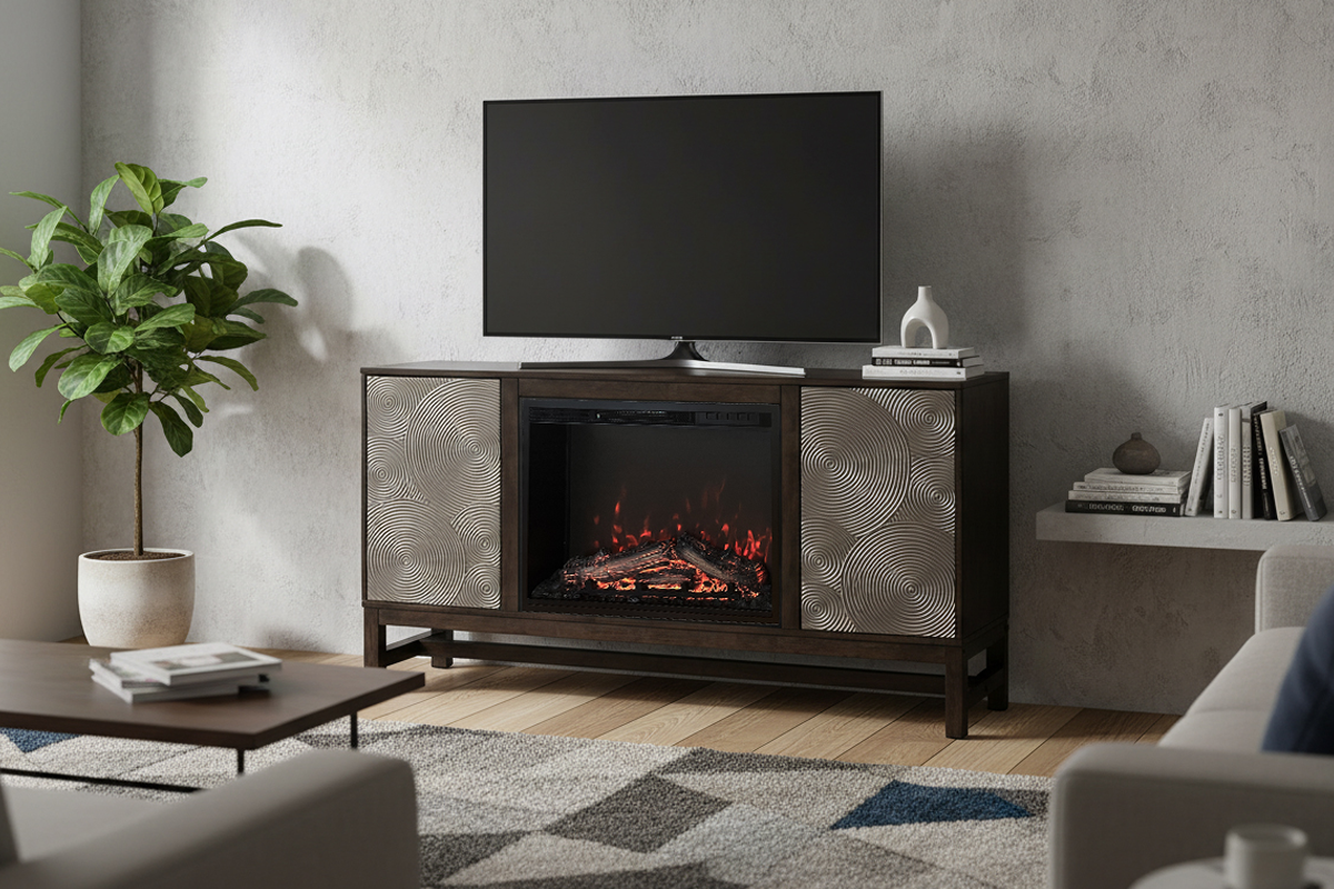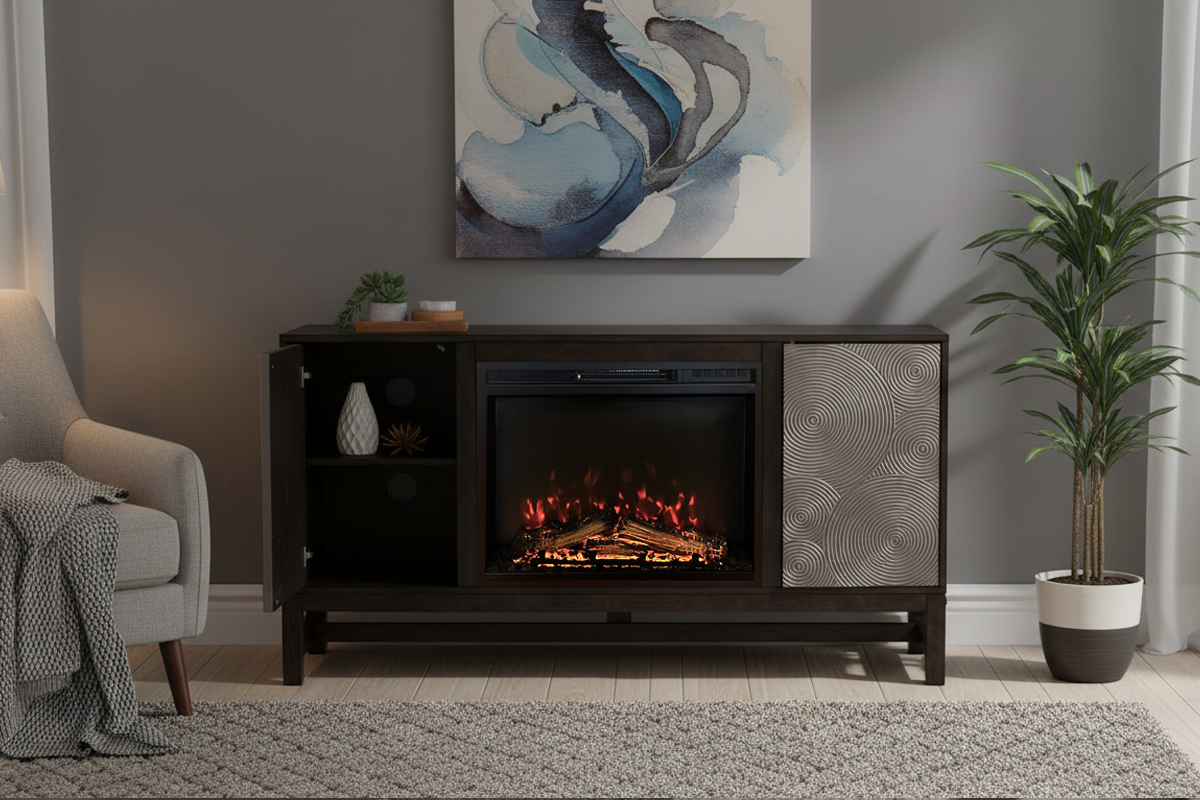 テクスチャード加工のドアが印象的なコンソール電気暖炉です。両サイドは、棚板付きの収納スペースになっています。