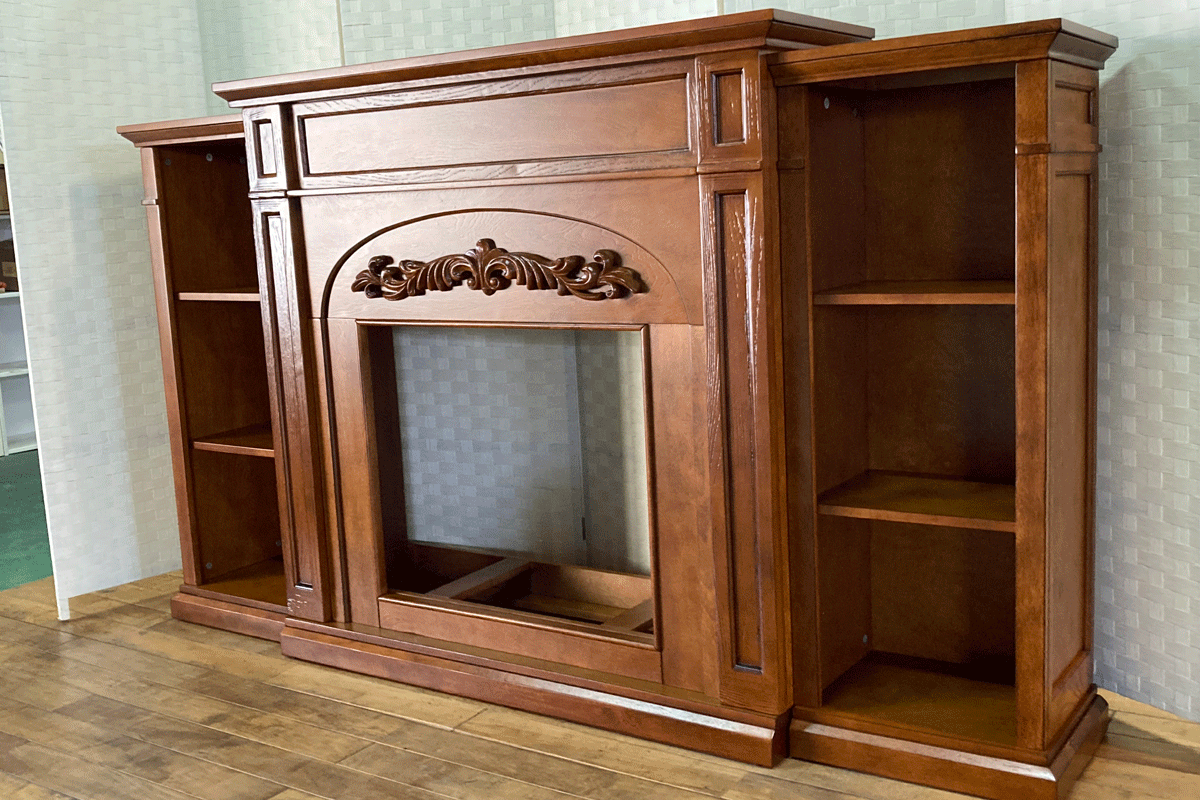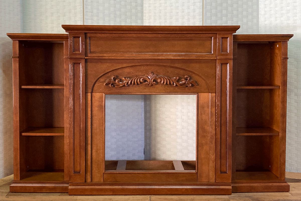 伝統的なデザインに繊細な彫刻が特徴のブックケース付暖炉棚です。