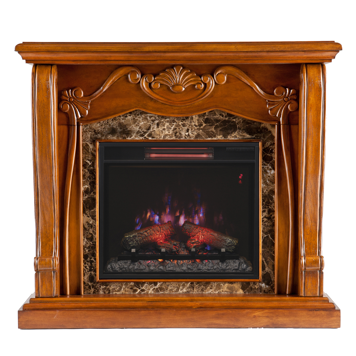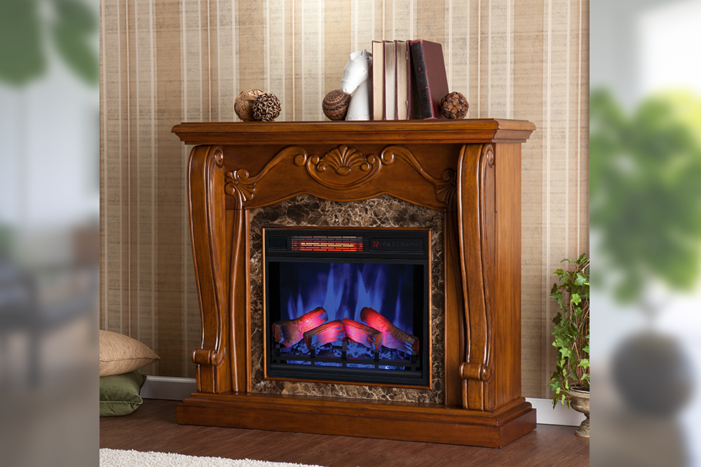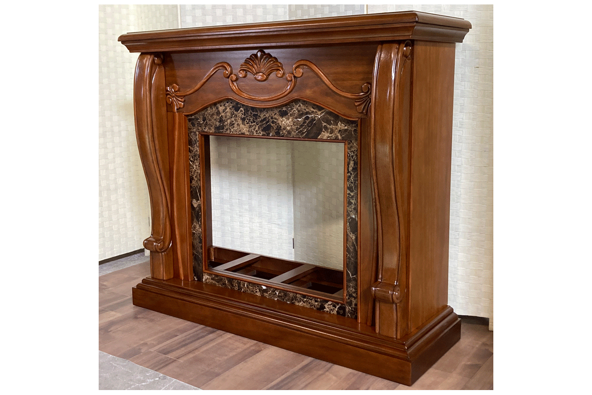 優雅なビクトリア調のデザインのウォールナット仕上げとブラウンマーブルの組合せが豪奢な電気暖炉です。