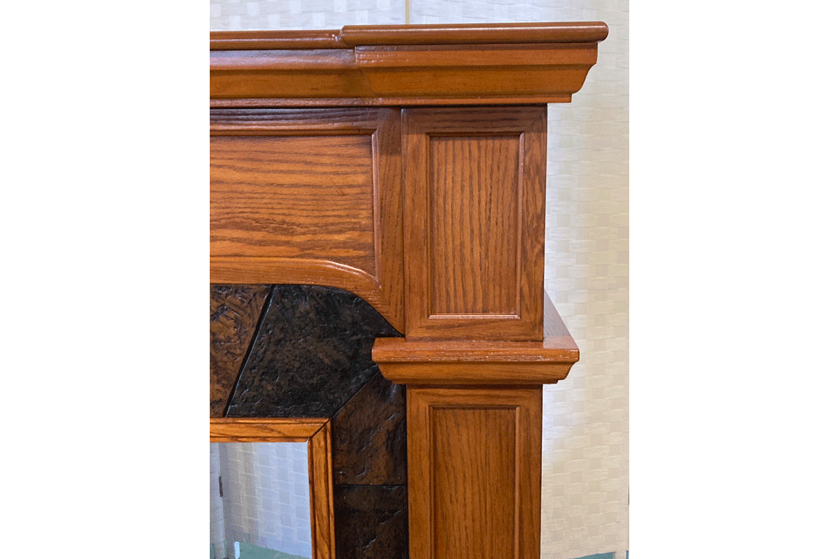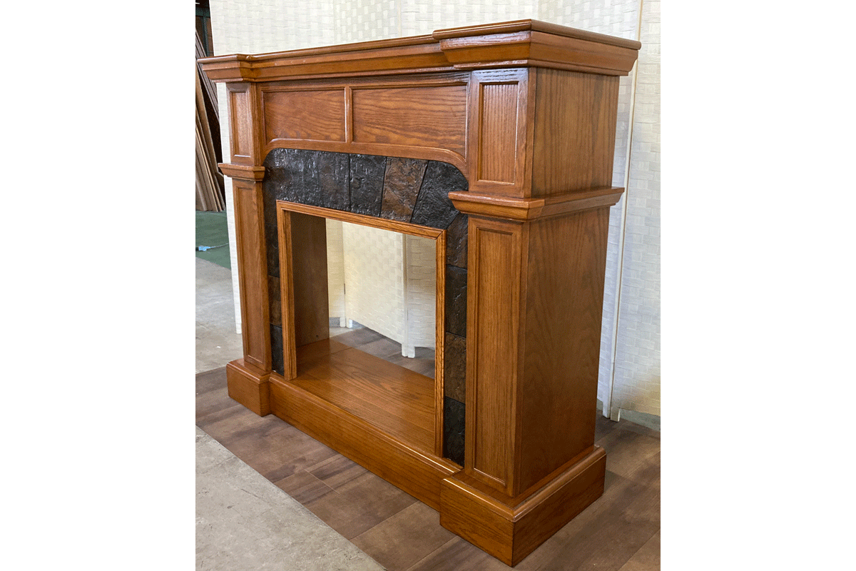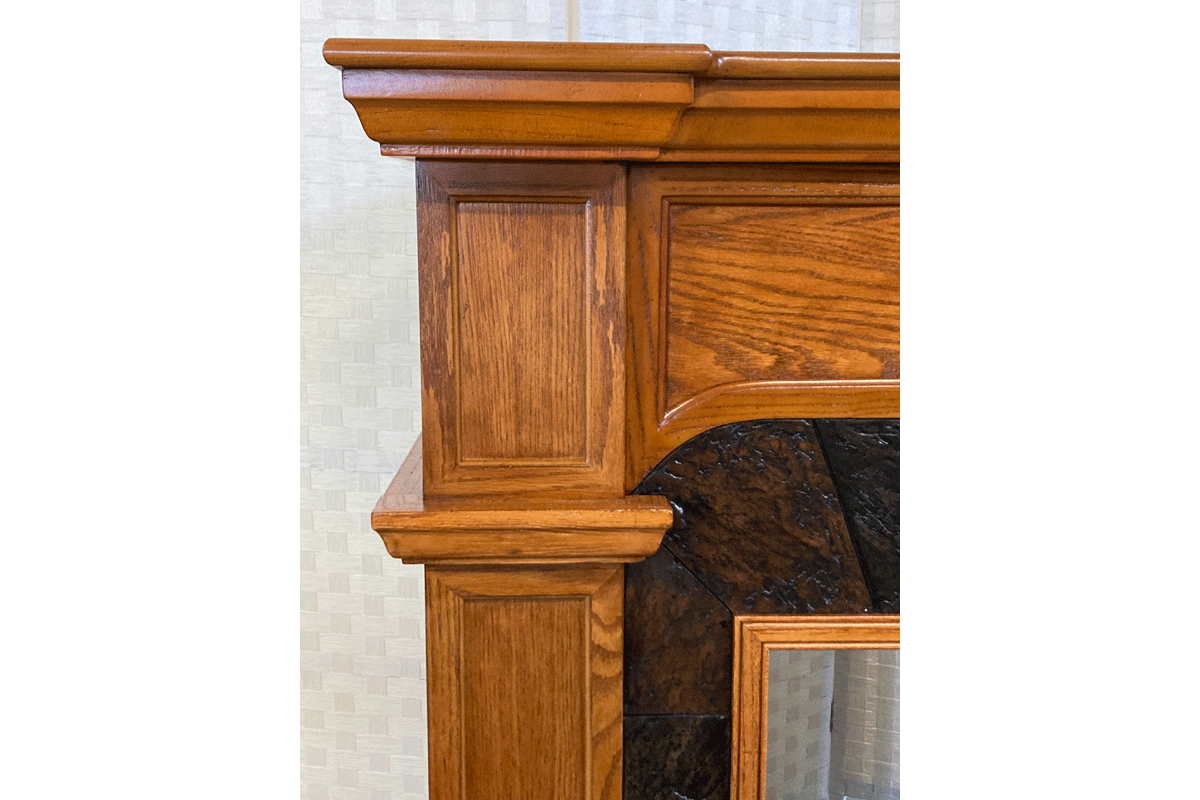 暖炉棚の背面は、フラットとコーナーの兼用タイプ。お部屋にあわせて、お好きな形でお使い頂けます。オークの木目が映えるミッションスタイルの伝統的なデザインとダークアースストーン(茶の中間色から濃い褐色)タイルの組合せ