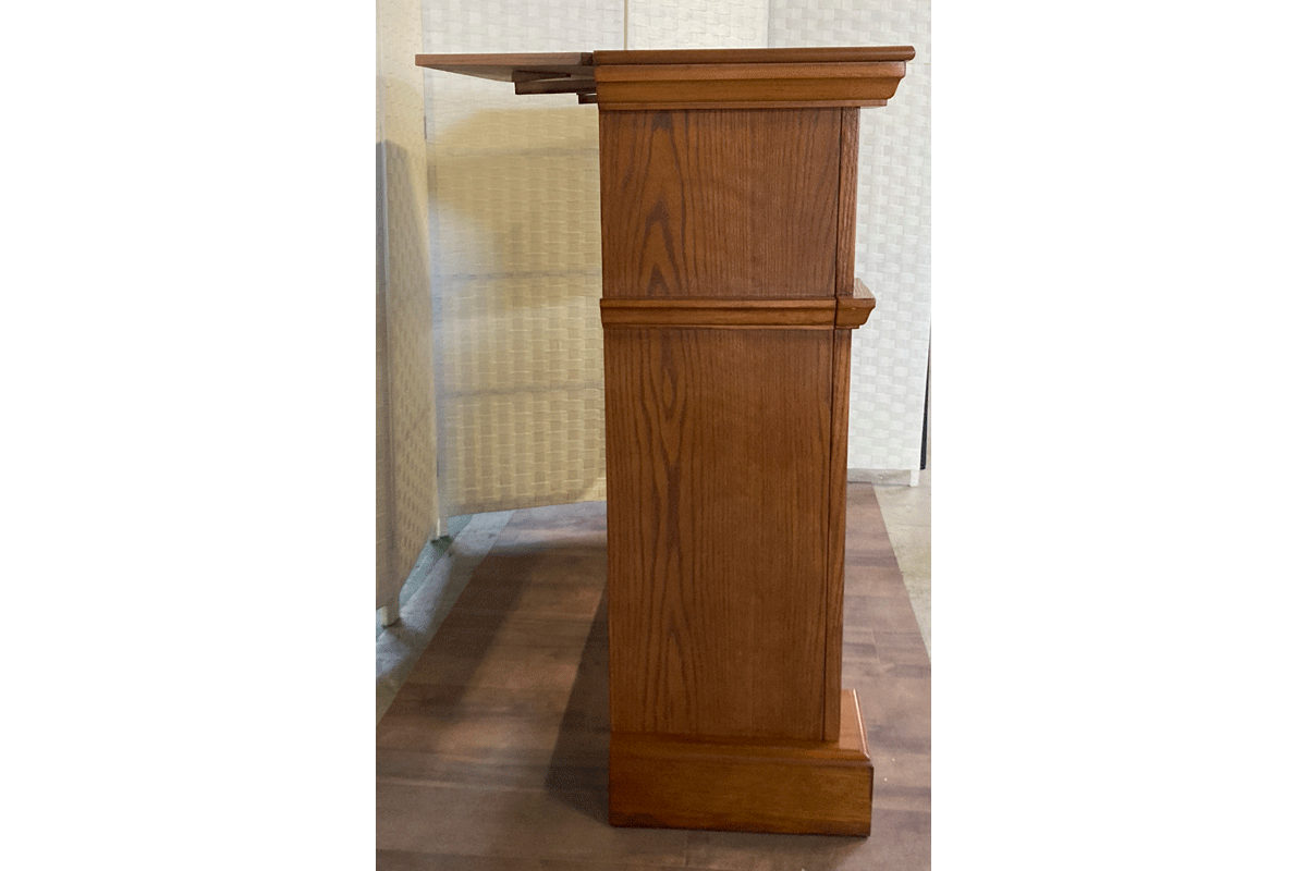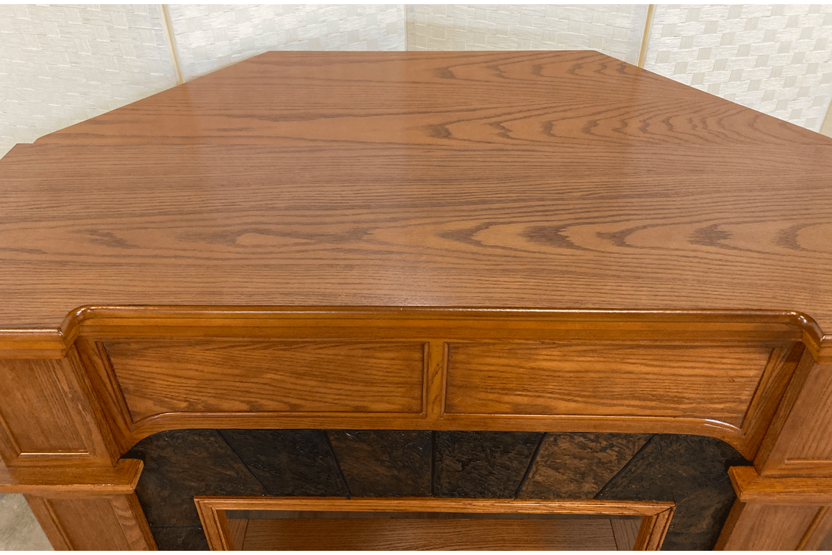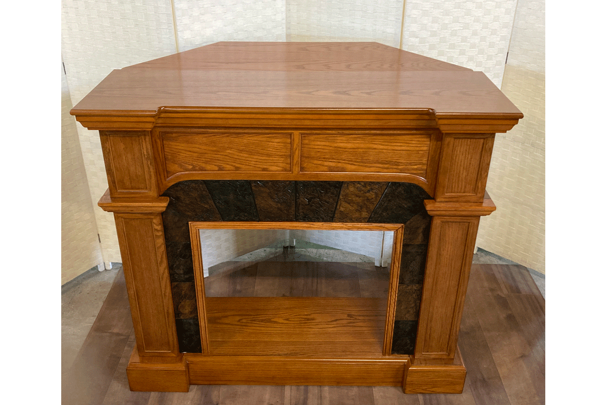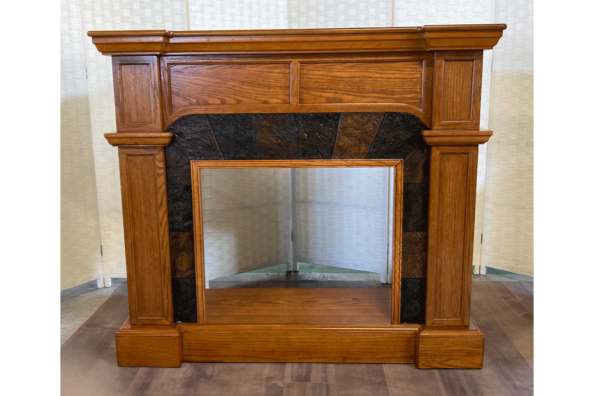 暖炉棚の背面は、フラットとコーナーの兼用タイプ。お部屋にあわせて、お好きな形でお使い頂けます。オークの木目が映えるミッションスタイルの伝統的なデザインとダークアースストーン(茶の中間色から濃い褐色)タイルの組合せ