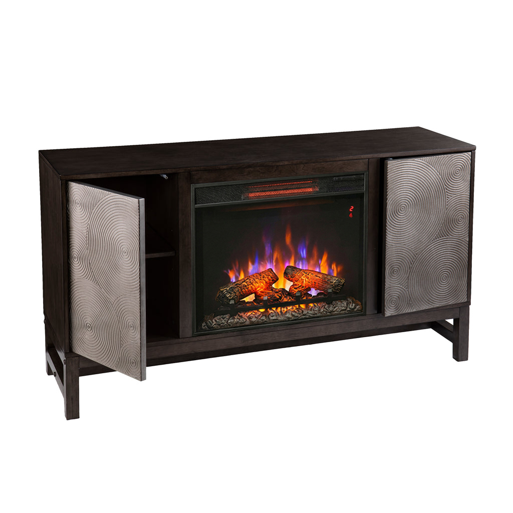 テクスチャード加工のドアが印象的なコンソール電気暖炉です。両サイドは、棚板付きの収納スペースになっています。